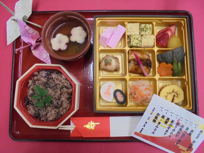・赤飯 ・魚の照り焼き ・松風焼き ・盛り合わせ ・紅白なます ・淡雪 ・苺、きんとん ・お吸物