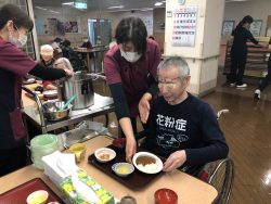 目の前で仕上げる臨場感に、食事のひとときを楽しんでいただけるよう企画したものです。広がるカレーの香りに、「いい香り」「美味しいね」「おかわり!」といった声が聞かれ、皆さまには大変満足して頂けました。また、来苑されたご家族からも「カレーのいい香りが1階から分かりました。いつも美味しい食事をありがとうございます」と嬉しいお言葉をいただいております。