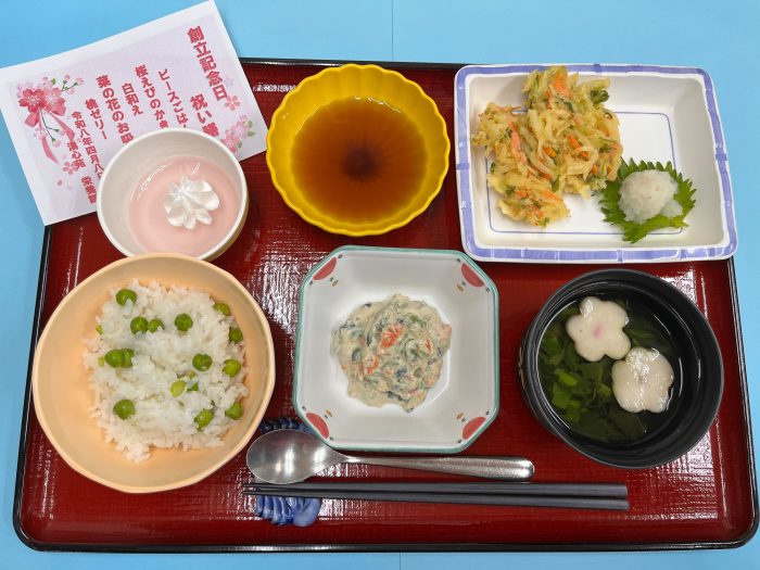 これからも「お年寄りの心を自分の心として・・」、この理念の下に地域の皆様のために努力してまいります。 本日、創立記念日に合わせて祝い膳として春の行事食をしました。