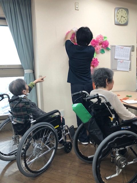 ご自身の貼った花が作品の一部になる喜びが、意欲的なリハビリにつながっています。フロアがパッと明るくなり、皆様の心にも温かい春の陽気が届いたようです。
