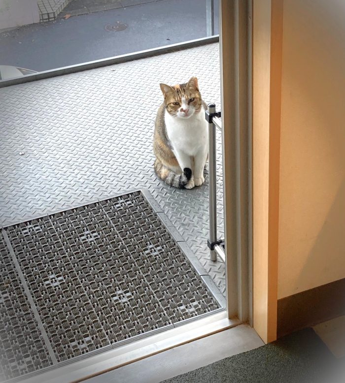 ある朝、事業所の玄関前にちょこんと座っていた地域猫。 まるで「今日もがんばってね」と見守ってくれているようでした。