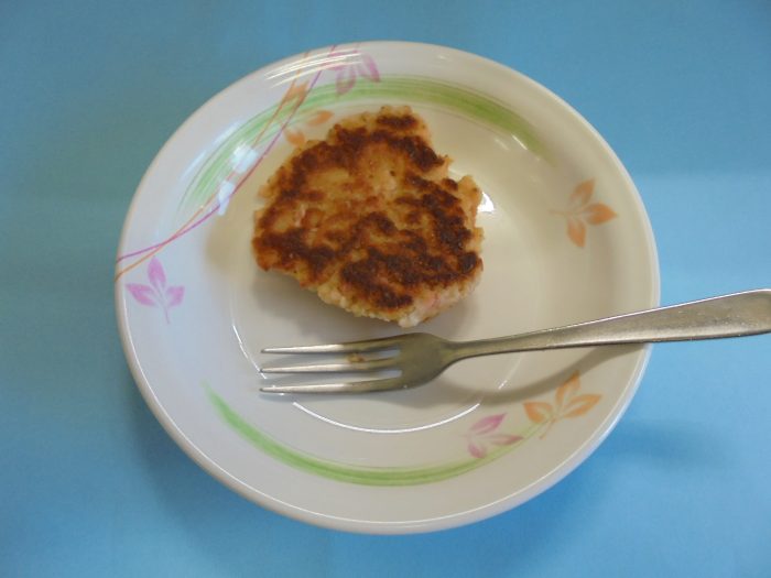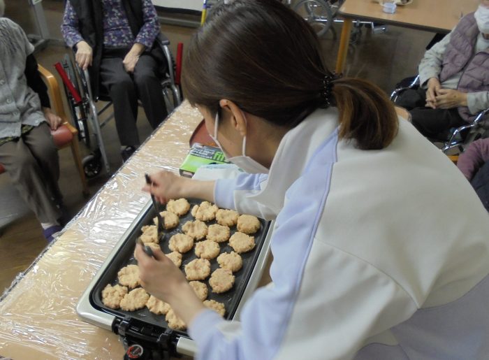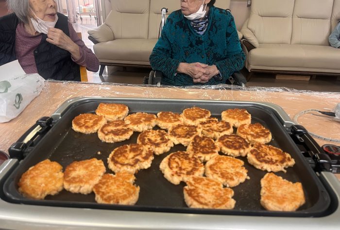 おやつは甘いものが多いため、塩系の要望を頂くことがあります。 今回はリクエストにお答えし、皆様の前で「はんぺんふわふわ焼き」を調理しました。 はんぺん をよくすりつぶし、いりごま、刻み紅生姜、卵、片栗粉を混ぜて丸めて、 ごま油で焼いています。最後に薄く醤油を塗って焦がすので、香ばしい香りがフロア に広がり好評でした。今後も、楽しめるおやつの時間を企画していきます。